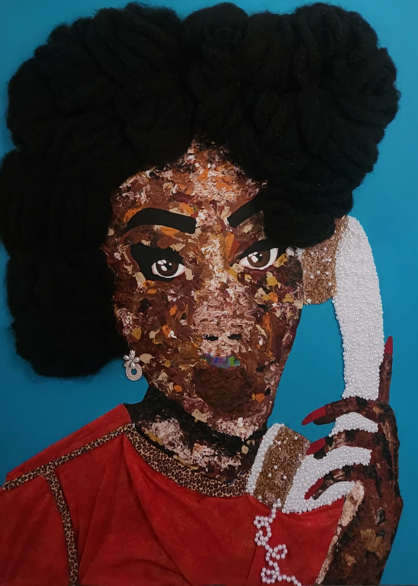 Size 30”x 40”x 1.5”. Acrylic paint, hair, pearls, beads, and fabric on stretched canvas.
